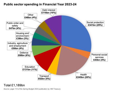 The NHS directly employs 2 million people and over 6 million work in the public sector (including the NHS). The scale of Government operations is vast. Of the roughly £1.3 trillion spent every year, the NHS makes up £250 billion.